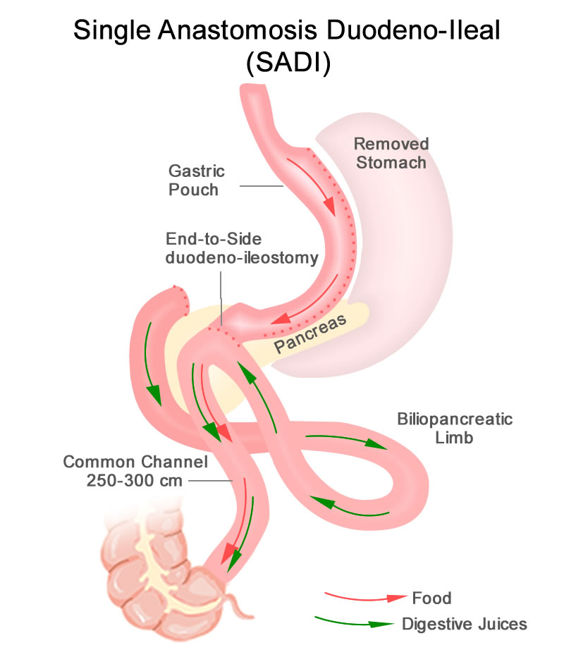 The Single Anastomosis Duodenal-Ileal Bypass with Sleeve Gastrectomy (SADI-S) is also known as a One Anastomosis Duodenal Switch (OADS). This is a recent (2007) procedure that modifies and combines both “Bileopancreatic Diversion (BPD) (an old established operation 1979)” with a “Duodenal Switch (DS) (established in 1986).